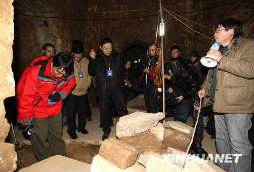 1月11日,專家考察團在考察墓內(nèi)情況。當日,中國社科院考古研究所專家考察團先秦、漢魏專家、體質(zhì)人類學專家、古代銘刻專家和東漢、魏晉都城研究專家等12人在安陽考察西高穴墓,考察內(nèi)容包括墓葬年代、墓葬型制、出土遺物和與墓主人身份相關(guān)的器物,這座墓就是引發(fā)爭議的“曹操墓”。新華社記者 汪永基攝