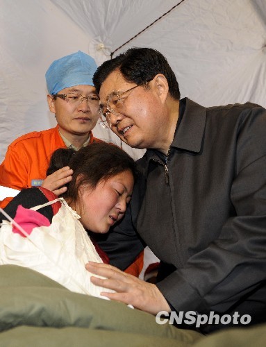 在一個醫療救治帳篷中,胡錦濤握住一位藏族受傷男子的手說,醫生們會給你提供精心的治療,你放心好了。你剛才也講了,房子沒有了,將來的生活怎么辦?中央和政府會幫助把房子蓋起來的,也會幫助重建家園。