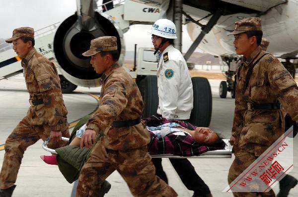 4月17日,一名地震危重傷員被解放軍戰(zhàn)士和機(jī)場(chǎng)急救人員抬往救災(zāi)飛機(jī)。新華社記者 郭剛 攝