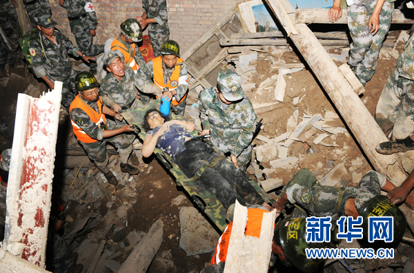8月8日20時(shí)50分左右,蘭州軍區(qū)某防化團(tuán)官兵救出一名幸存者。甘肅舟曲縣特大山洪泥石流災(zāi)害發(fā)生后,蘭州軍區(qū)某防化團(tuán)602名官兵經(jīng)過6個(gè)多小時(shí)的急行軍到達(dá)災(zāi)區(qū),隨即展開人員搜救,截至8日20時(shí)50分共救出9名幸存者。目前,官兵們?nèi)赃B夜奮戰(zhàn)在救援一線,爭分奪秒進(jìn)行生命大營救。新華社發(fā) (張永進(jìn) 攝)