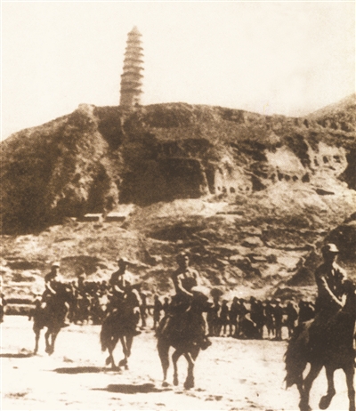 延安寶塔山下的抗日騎兵。斯諾 攝(解放軍報資料照片)