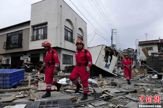 3月15日下午,幾天前抵達日本巖手縣大船渡市的中國國際救援隊隊員在進行搜救。大船渡市緊鄰海港,是此次日本大地震中受災最嚴重的地區之一。中新社發 侯宇 攝