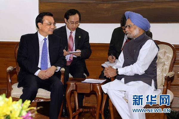 5月19日,國務院總理李克強在新德里與印度總理辛格小范圍會見。 新華社記者 李濤 攝