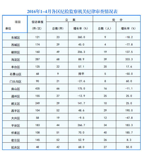 人民網北京5月13日電 據中央紀委監察部網站消息,2016年1月至4月,北京市各級紀檢監察機關共接受信訪舉報5407件(次),立案815件,增長59.5%。給予黨紀政紀處分532人,增長52%,其中局級1人,縣處級138人,鄉科級122人。移送司法25人。查處違反中央八項規定精神和市委實施意見123人,“小官貪腐”104人。