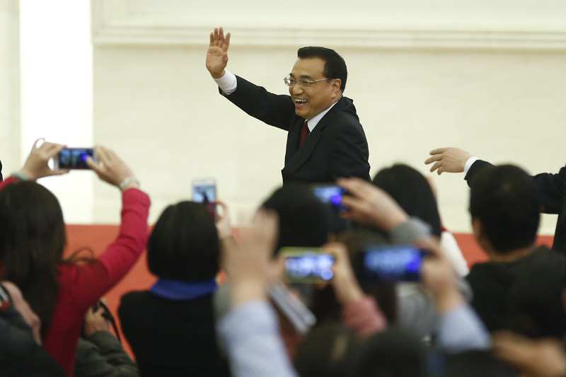 2016年3月16日上午,十二屆全國人大四次會議閉幕后,國務(wù)院總理李克強(qiáng)在人民大會堂三樓金色大廳會見采訪十二屆全國人大四次會議的中外記者并回答記者提出的問題。(資料圖)
