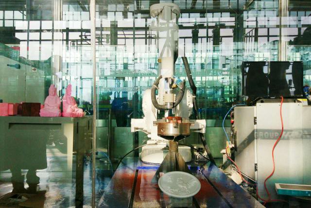 這是雕刻機器人,能夠對軟金屬或軟材料進行高速鉆削和雕刻,還可以根據三維模型自動生成加工軌跡,比人工更加精準。