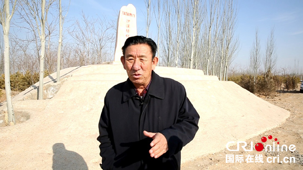 人大代表、治沙英雄、全國勞模王有德在Tata木門公益林碑前 攝影高翰倫