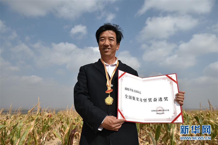 在寧夏鹽池縣曾記畔村,朱玉國展示他獲得的獎(jiǎng)項(xiàng)(10月20日攝)。 (新華社記者 李然 攝)