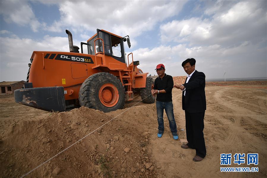 在寧夏鹽池縣曾記畔村,朱玉國(右)在工地查看村飼料加工廠的建設(shè)情況(10月20日攝)。(新華社記者 李然 攝)