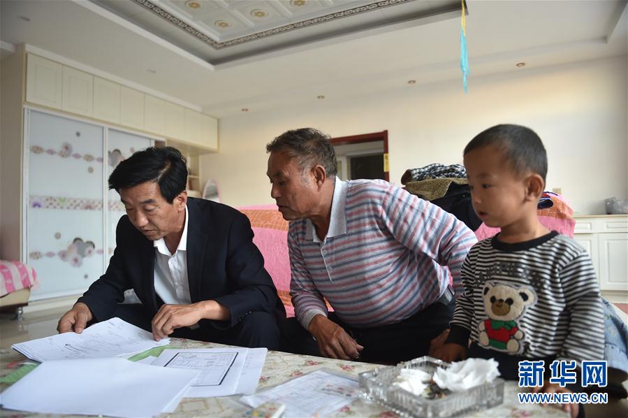 在寧夏鹽池縣曾記畔村,朱玉國(左)在村民家中了解脫貧情況(9月20日攝)。(新華社記者 李然 攝)