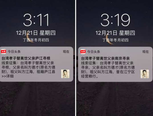 接到求助信息后,頭條尋人立刻發布了《今日頭條兩岸尋親:臺灣孝子替離世父親尋根 尋找合肥或南京的親屬》的尋親消息,把他精準地彈窗推送給了安徽合肥和江蘇南京的網友,短短4個小時之后,就成功聯系上了方志鵬要找的大陸親人方英懷。