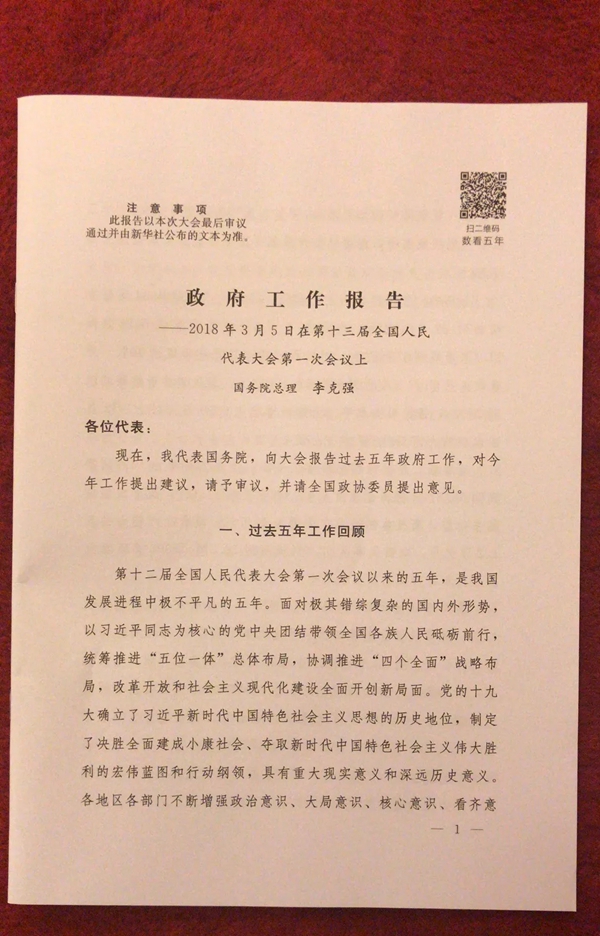 今年的政府工作報告首頁上,又出現了一個小小的二維碼。