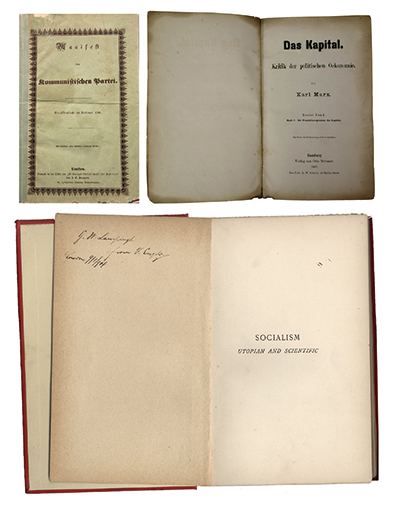 上圖為1848年《共產(chǎn)黨宣言》德文第一版。右上圖為1867年《資本論》德文第1卷第一版。下圖為恩格斯的題字贈(zèng)書《社會(huì)主義從空想到科學(xué)的發(fā)展》,1892年英文版。 中央黨史和文獻(xiàn)研究院供圖