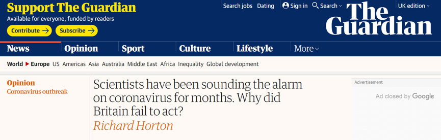 《柳葉刀》的主編理查德·霍頓18日在《衛報》發表文章,感激中國科學家預警,痛批英國錯失控制新冠肺炎疫情的良機。他說,疫情發生后,中國科學家1月24日報告了第一例新冠肺炎病亡案例,并警示了疫情的嚴重性。然而英國忽視了這些信號,浪費了寶貴的時間,也失去了控制疫情的最佳時機。