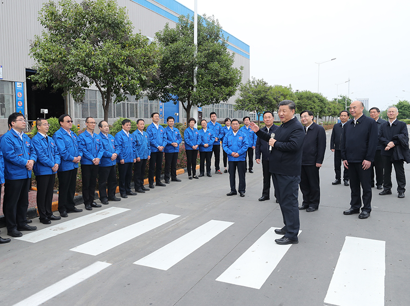 △2020年4月20日至23日,中共中央總書記、國家主席、中央軍委主席習近平在陜西考察。這是4月22日,習近平在陜西汽車控股集團有限公司考察時,同企業職工親切交流。