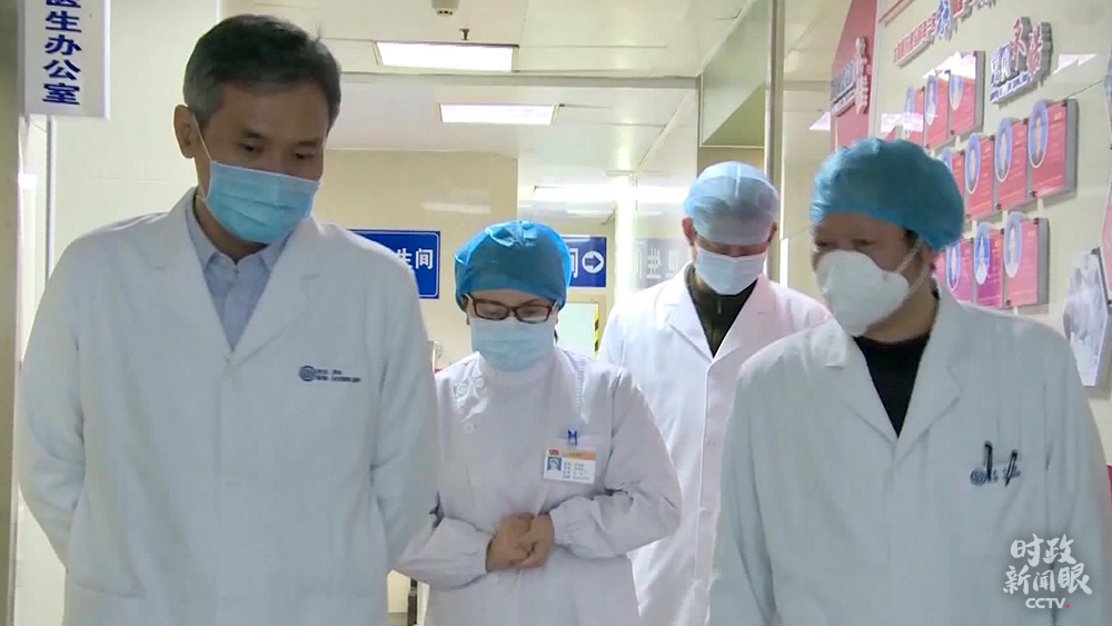 △疫情暴發后,羅杰(左一)帶領十堰市救治專家組奮戰在抗疫最前線,“吃住不離院”。