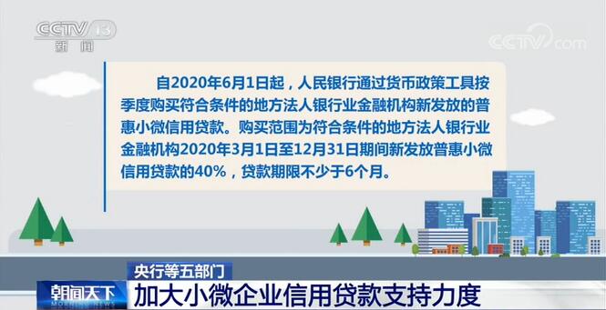 央視網(wǎng)消息:近日,中國人民銀行、銀保監(jiān)會、財政部等五部門發(fā)布關(guān)于加大小微企業(yè)信用貸款支持力度的通知。自2020年6月1日起,人民銀行通過貨幣政策工具按季度購買符合條件的地方法人銀行業(yè)金融機構(gòu)新發(fā)放的普惠小微信用貸款。購買范圍為符合條件的地方法人銀行業(yè)金融機構(gòu)2020年3月1日至12月31日期間新發(fā)放普惠小微信用貸款的40%,貸款期限不少于6個月。