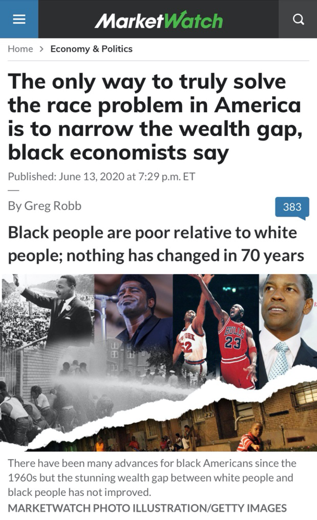 目前美國白人與非裔的財(cái)富現(xiàn)狀是,白人普遍擁有較好社會(huì)資源、銀行信用、房屋遺產(chǎn)等,可以更為輕松地通過社會(huì)系統(tǒng)獲取經(jīng)濟(jì)利益。相比之下,非裔必須通過更多儲(chǔ)蓄才能維持與白人相當(dāng)?shù)呢?cái)富。但是當(dāng)前美國社會(huì)制度下,非裔面臨著來自職場(chǎng)、住房市場(chǎng)、金融市場(chǎng)等的多重障礙。