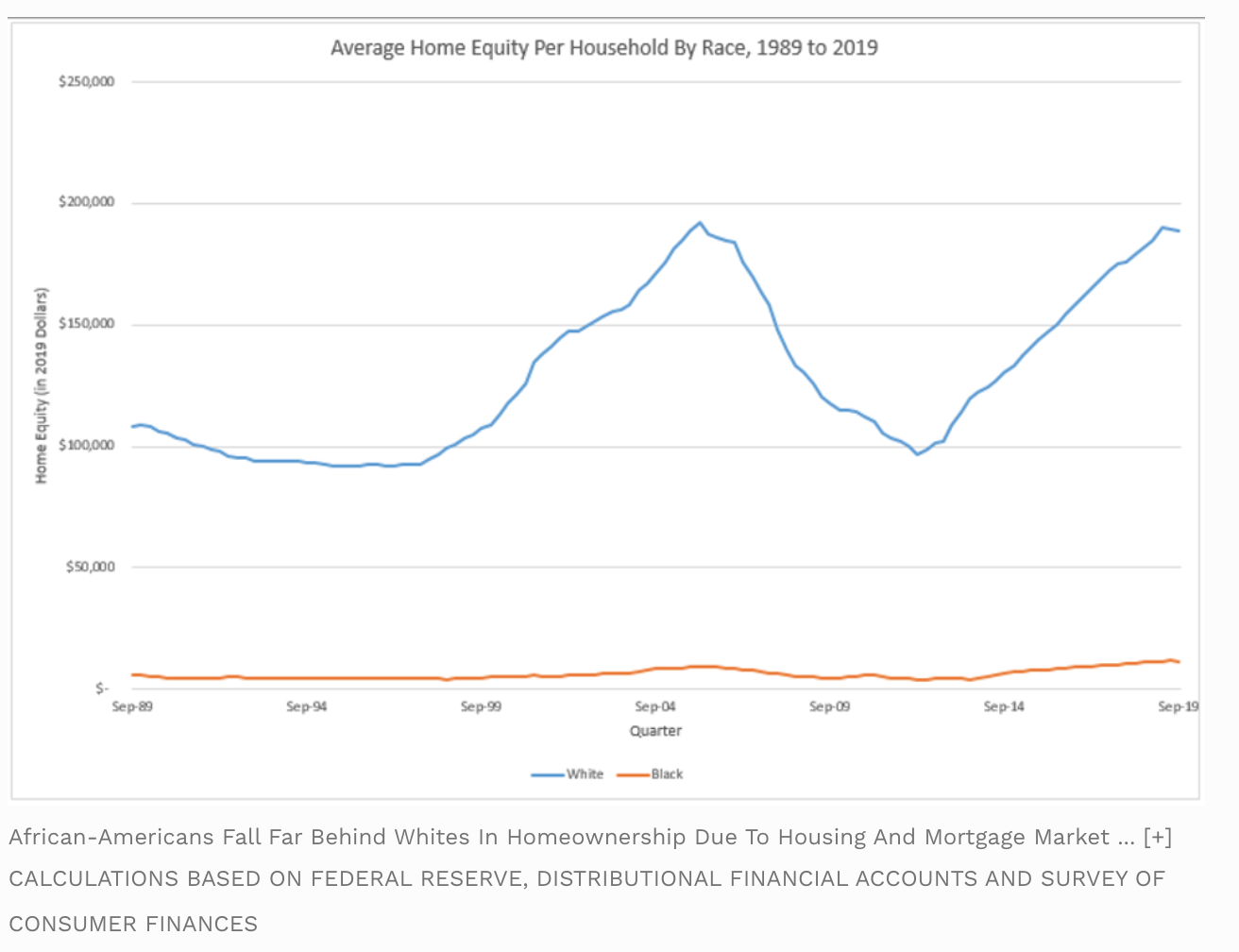 住房是美國積累財(cái)富的主要來源之一,而“吉姆·克勞法”則自1920年開始,就系統(tǒng)性地將非裔排斥在美國住房市場(chǎng)之外,再加上歧視性的銀行信貸政策,使得很多美國非裔沒有自己的固定資產(chǎn)和家族繼承財(cái)產(chǎn),完全無法積累財(cái)富。而與此同時(shí),政府卻制定政策,幫助白人通過住房獲得財(cái)富,于是,貧富差距不斷擴(kuò)大。截至2019年9月,非裔家庭的平均資產(chǎn)不到23萬美元,而白人家庭的平均資產(chǎn)則超過了110萬美元。