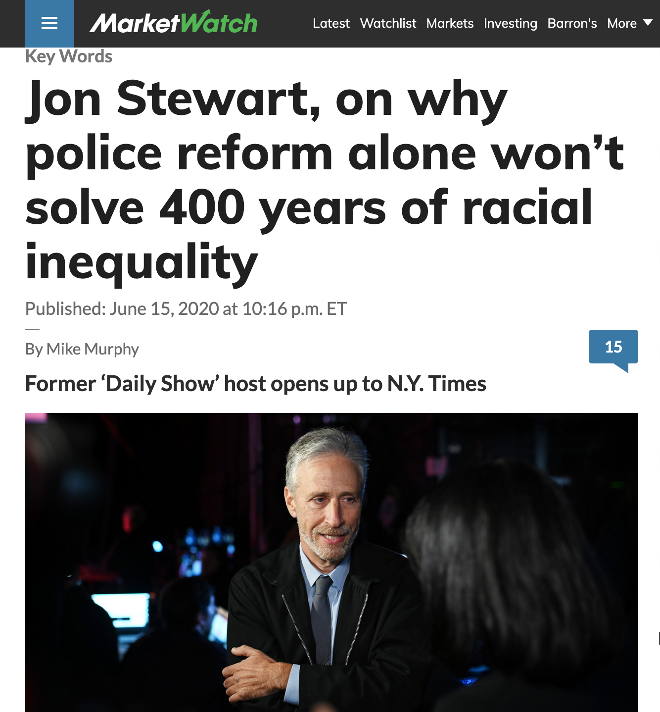 △“每日秀”前主持人斯圖爾特表示,警務(wù)改革不能解決400年的種族歷史問題