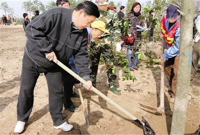 2007年2月28日,習(xí)近平在杭州錢江新城副陽臺景觀綠化工程現(xiàn)場參加義務(wù)植樹活動。