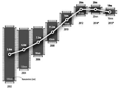 為了衡量芯片的技術(shù)進步,行業(yè)內(nèi)用了“制程”這個概念,隨著芯片上晶體管的尺寸減小,制程也就越小,芯片上能容納的晶體管數(shù)量就越多,也就是說制程越小,芯片的性能就越好。