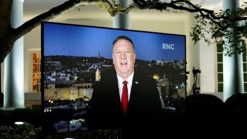 8月25日,美國國務卿蓬佩奧在耶路撒冷通過視頻在共和黨全國代表大會上講話。(圖片來源:路透社)