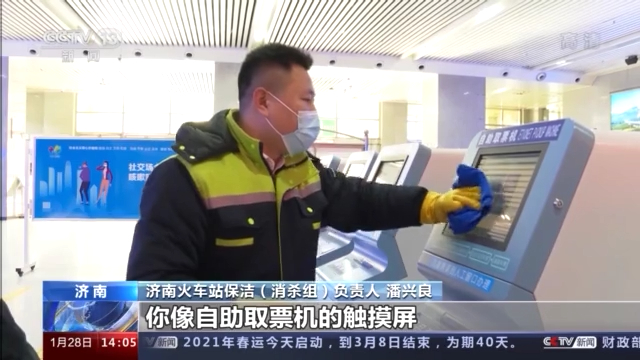濟南火車站保潔(消殺組)負責人 潘興良:你像自助取票機的觸摸屏、電梯的扶手帶,包括水龍頭開關,旅客使用比較頻繁,所以由原來的兩小時一次消毒改為現在的一小時一次消毒。