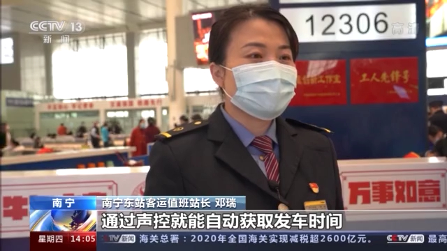 南寧東站客運值班站長 鄧瑞:我們配備6臺12306智能客服機,使用時無需接觸,通過聲控就能自動獲取發車時間、發車時長、檢票口位置等信息。