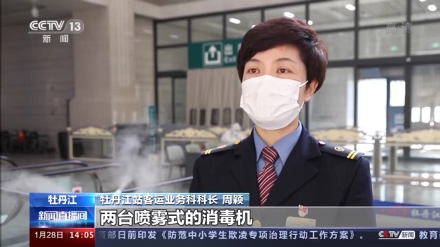 牡丹江站客運業務科科長 周穎:我們在進站扶梯處增設了兩臺噴霧式的消毒機,由原來的人工定時對扶梯消毒變成了現在的實時消殺。