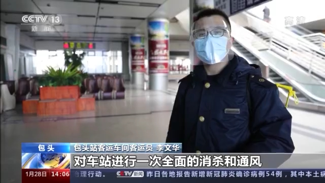 包頭站客運車間客運員 李文華:我們現在是每3小時對車站進行一次全面的消殺和通風,對驗票的閘機、電茶爐、洗手池面臺、衛生間進行擦拭消毒,對候車室的地面和進出站通道噴灑稀釋后的消毒液。