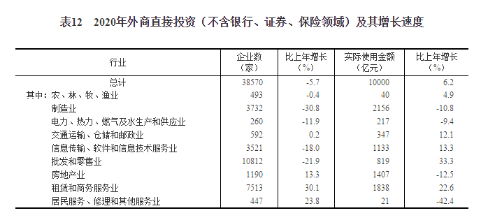2020年外商直接投資(不含銀行、證券、保險領(lǐng)域)新設(shè)立企業(yè)38570家,比上年下降5.7%。實際使用外商直接投資金額10000億元,增長6.2%,折1444億美元,增長4.5%。其中“一帶一路”沿線國家對華直接投資(含通過部分自由港對華投資)新設(shè)立企業(yè)4294家,下降23.2%;對華直接投資金額574億元,下降0.3%,折83億美元,下降1.8%。2020年高技術(shù)產(chǎn)業(yè)實際使用外資2963億元,增長11.4%,折428億美元,增長9.5%。