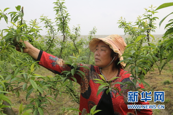 基地工人楊明英為李樹抹芽(攝于3月31日)。新華網 蔡連素攝