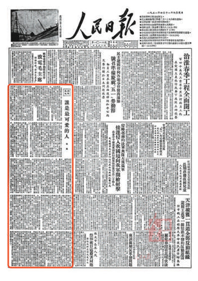 圖為1951年4月11日,《誰(shuí)是最可愛(ài)的人》首發(fā)于人民日?qǐng)?bào)頭版。