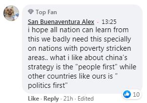 網(wǎng)友San Buenaventura Alex在臉書上留言說(shuō):“我希望全世界向中國(guó)學(xué)習(xí)減貧經(jīng)驗(yàn),特別是一些貧困的國(guó)家。我贊賞中國(guó)‘人民至上’的理念,而不是像我們國(guó)家這樣‘政治至上’。”