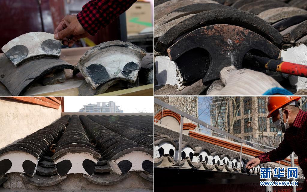 一大會址屋頂的瓦當別具特色——白底上畫著兩個對稱的黑色橢圓形,像一雙“熊貓眼”。這張拼版照片左上為工人拆下來的舊瓦當;右上為工人用工具為瓦當“點睛”;左下為已鋪好的新瓦當;右下為已鋪好的新瓦當(1月14日攝)。