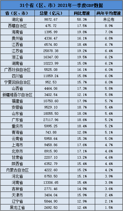從兩年平均增速來看,西藏自治區(qū)、海南、貴州、江西、江蘇、浙江、湖南、廣西壯族自治區(qū)、四川、寧夏回族自治區(qū)十個(gè)省(區(qū))的增速均達(dá)到了6%及以上。國(guó)家統(tǒng)計(jì)局公布的數(shù)據(jù)顯示,一季度中國(guó)GDP兩年平均增長(zhǎng)5%,而 19個(gè)省(區(qū)、市)達(dá)到或超過了這一平均水平。