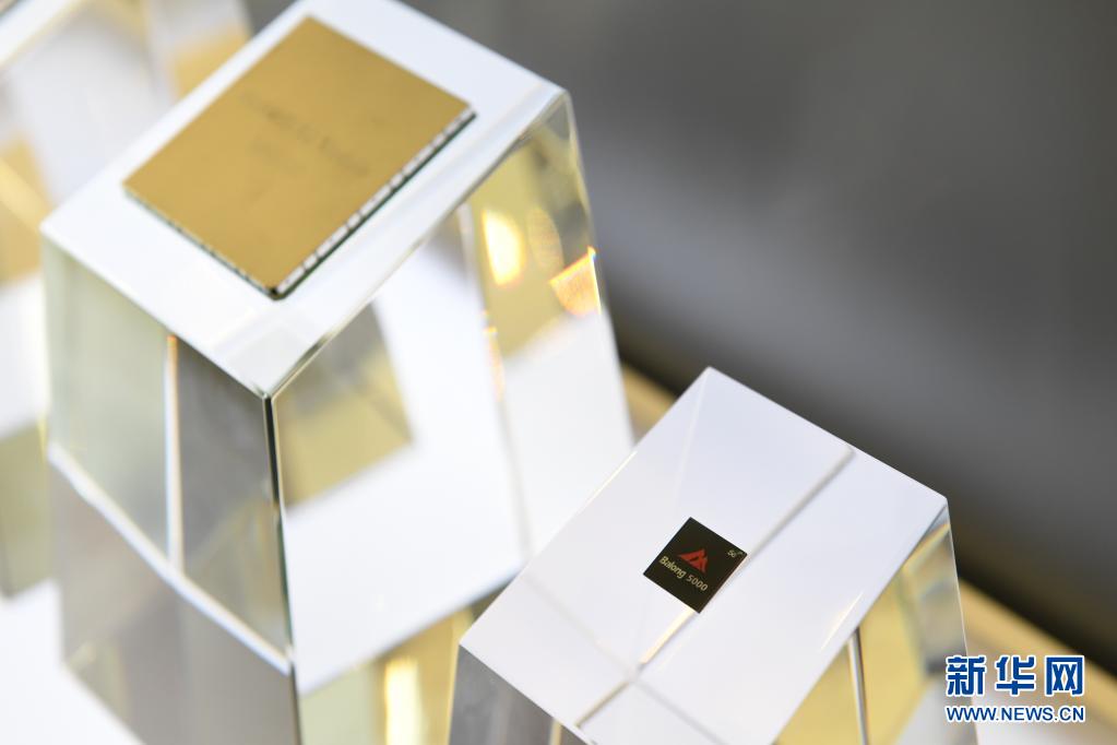 2019年10月23日拍攝的巴龍5000芯片以及搭載該芯片的5G工業模組。新華社記者 毛思倩 攝