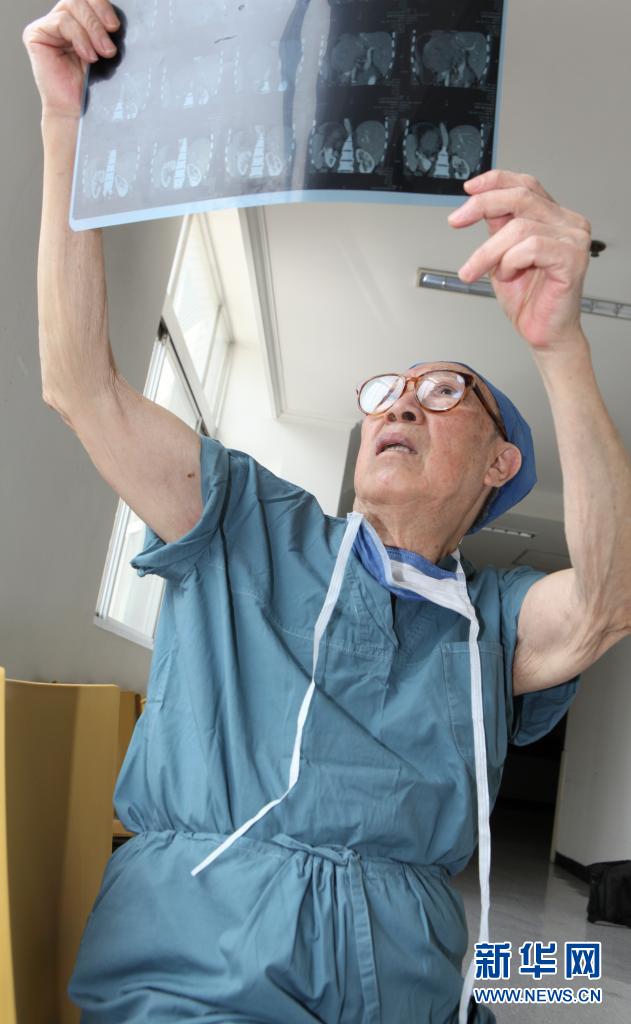 年近90的吳孟超院士在手術后分析患者的核磁共振結果(2011年4月13日攝)。新華社發(張鵬 攝)