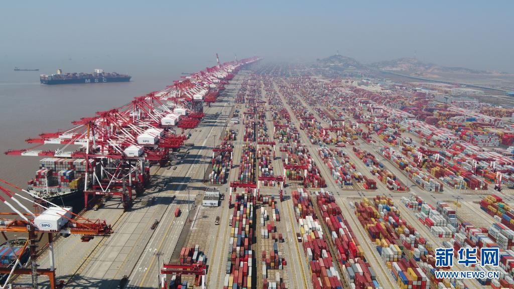 這是2020年3月18日拍攝的上海洋山港集裝箱碼頭(無人機照片)。新華社記者 丁汀 攝