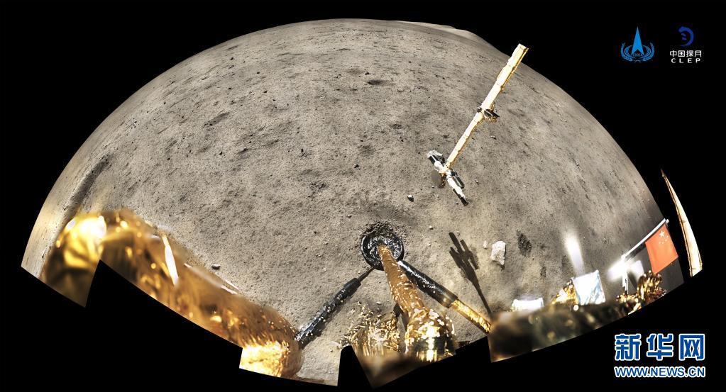 2020年12月4日,國家航天局公布了探月工程嫦娥五號探測器在月球表面國旗展示的照片。嫦娥五號著陸器和上升器組合體全景相機環拍成像,五星紅旗在月面成功展開,此外圖像上方可見已完成表取采樣的機械臂及采樣器。新華社發(國家航天局供圖)