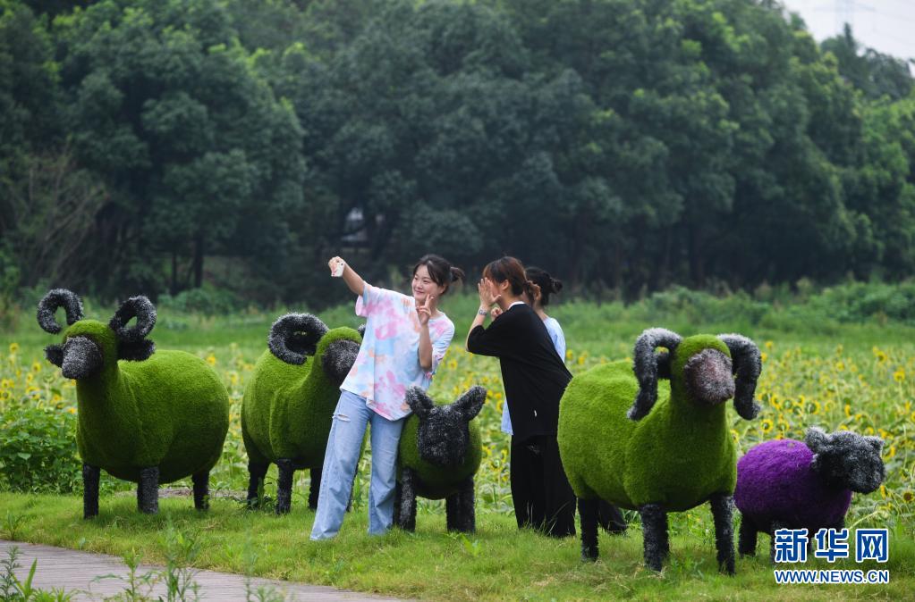 8月10日,幾名游客在南山村特色度假小鎮的向日葵花田旁自拍留影。