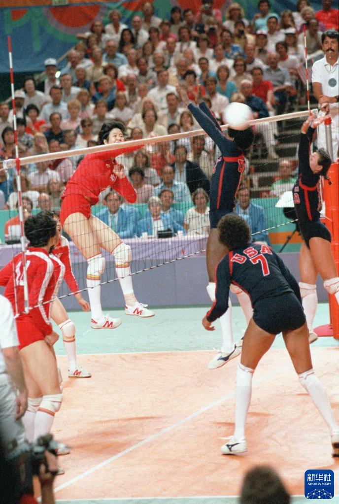 1984年8月7日,中國(guó)隊(duì)主攻手郎平在洛杉磯奧運(yùn)會(huì)女排決賽中大力扣殺。新華社記者官天一攝