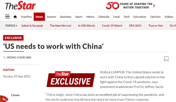 馬來西亞《星報》9月5日報道稱,美國哥倫比亞大學可持續發展中心主任杰弗里·薩克斯表示,美國必須與中國合作“尋找應對新冠肺炎疫情的全球解決方案”,才能結束肆虐全球的疫情。