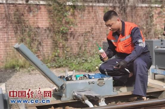 電務(wù)人員維修道岔轉(zhuǎn)轍機(jī)。中國經(jīng)濟(jì)網(wǎng)記者佟明彪/攝