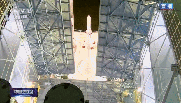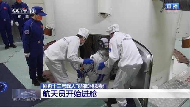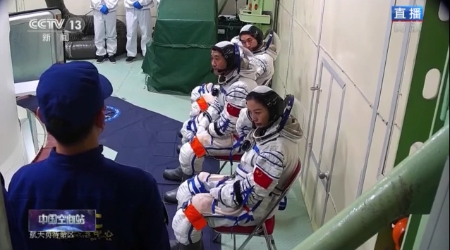 3名航天員到達發射塔架,準備進入神舟十三號返回艙,等待飛船發射。