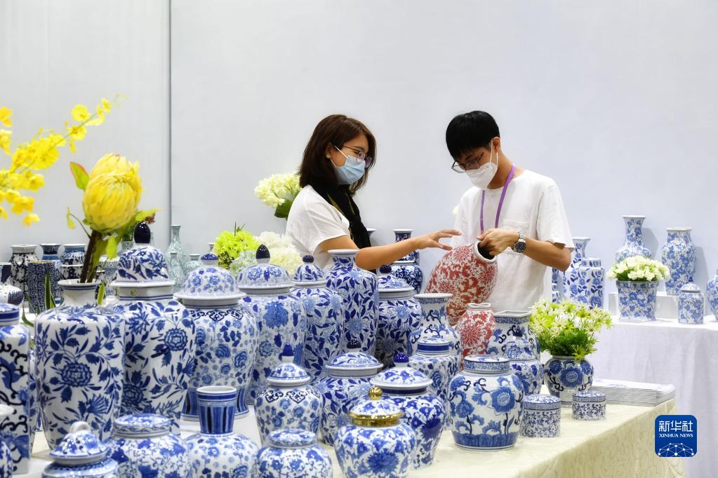 10月15日,一名國內采購商(左)在第130屆廣交會瓷器展臺洽談。新華社記者 劉大偉 攝