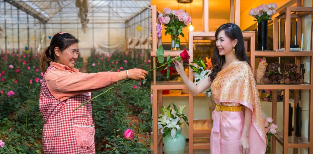 ↑2019年2月,泰國曼谷的一位女士(右)“接過”云南花農“遞出”的一支鮮花(拼版照片)。