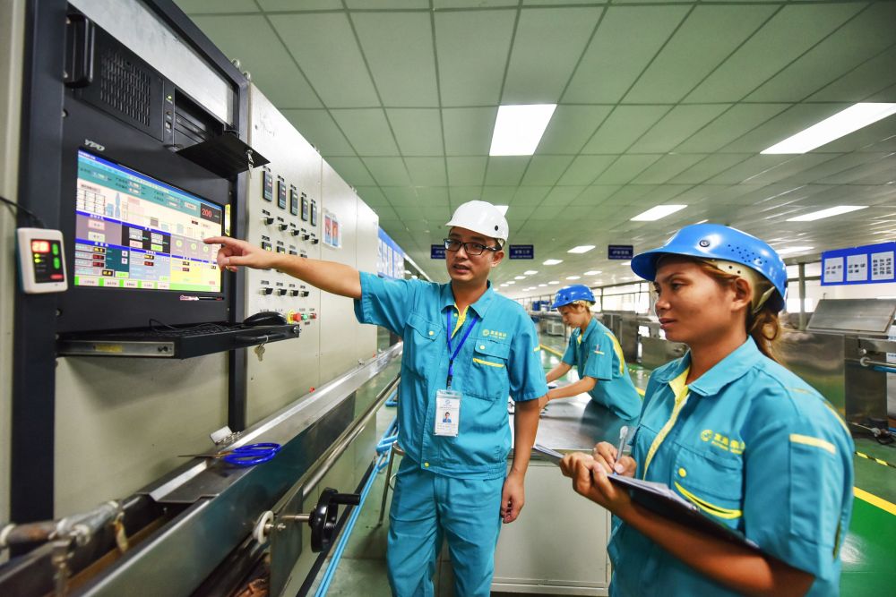 ↑2015年5月11日,在泰國羅勇的泰中羅勇工業園,中國技術人員(前左)對泰國工人進行技術指導。