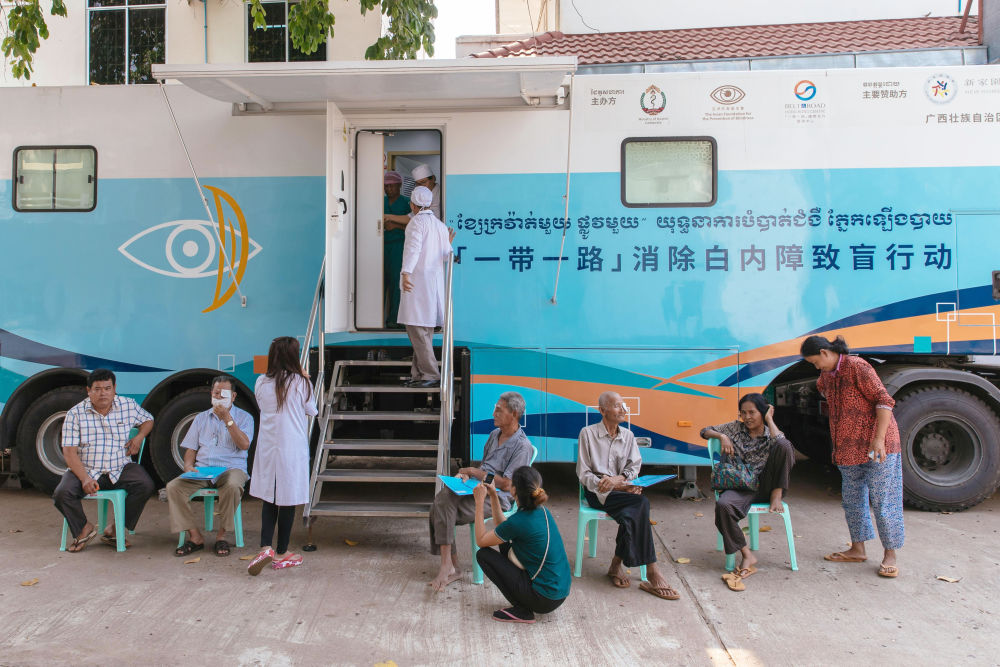 ↑2019年3月15日,在柬埔寨磅湛省醫院,白內障患者在“一帶一路”消除白內障致盲行動醫療隊的醫療車外等待接受手術治療。